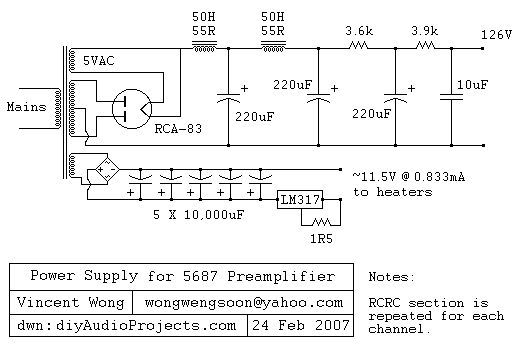 图片01 - 5687的Hi-Fi电子管前置放大器电源供应器,RCA-83水星整流管该电源采用一个RCA-83水银整流管。欧姆龙定时器用于延迟的B +,以允许整流热身。最后2 RC部分(3K6,220UF,3K9,10uF的)每个通道是独立的,但在未来,我计划要删除,每个通道的,而不是使用CCS。10uF的电容是聚苯乙烯。是的,这些都是50H电抗器! RCA-83整流器使用5VAC的细丝。从一个全桥MUR860二极管,然后通过5×10,000 uF的Elna的上限为5687管中所提供的加热器。830毫安使用LM317稳压器和一个1R5 ADJ和VOUT引脚之间的电阻,电流调节提供。Votlage管是11.5V左右,所以我实际运行饥饿的细丝。管的电源设计的更多信息,看到马特的infomative的文章真空管放大器的电源设计。 电源的示意图如图02所示。 图02 - 5687管前置放大器电源原理图