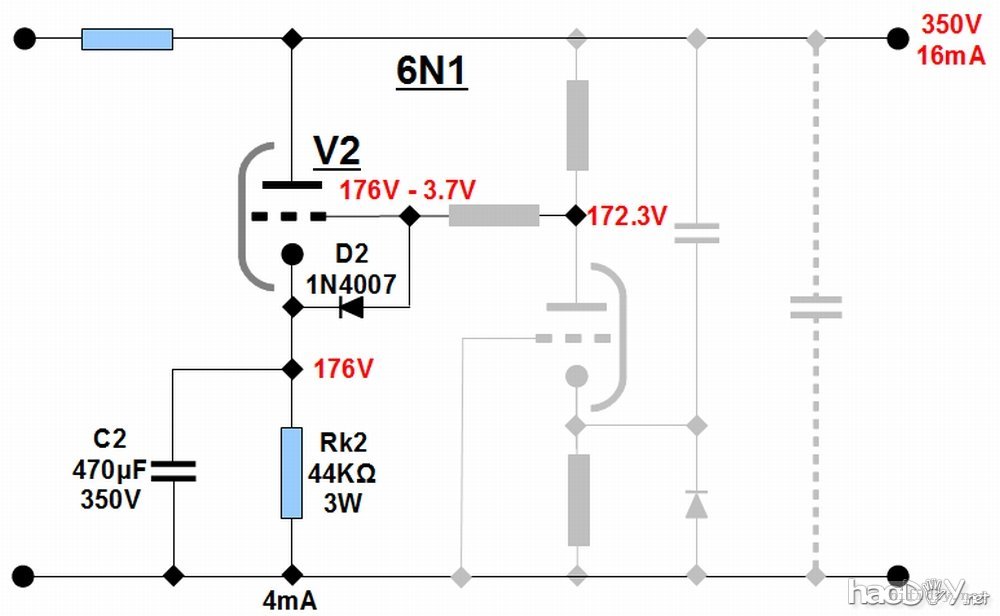 Rk2 = (HT – Vak2) / Ia2 = (350-175)V / 4mA = 43.75KΩ,