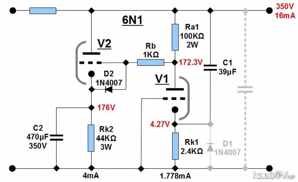 通常这类设计多用 12AX7 作放大,取其有較高增益(A),再交至 12AU7 作并联稳压(输出),使电路的总跨导(gmT)可作大幅度提高,因