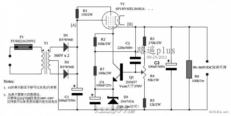 这是刚完成的采用低压(16V)稳压二极管的胆石混合宽范围调压稳压胆机电源,整流管则采用软开关高速二极管BYW96E,其整流特性接近胆整流,开关噪声很低,比1N4007或FR和BYV等普通或快恢复整流二极管优秀得多。这个电源电压调整范围宽,稳压性能优良,输出波纹低,而且调整胆选择灵活。用在WCF和J版胆前级非常适合,有兴趣者可以一试。 稳压管D3的选择范围可以很宽,10~20V/1W的都可以。但要注意的是,当选择的稳压管稳压值在14V以下时,R5要由12K改为8.2K,不然有可能R4调到最小,最大稳压输出都达不到360V。 这是改进电路,比原电路更简单,性能更好,输出波纹更低,调压范围也更宽。如果调压电压范围不需要那么宽的,变压器次级的交流电压也可以降低,只要保证输入[A] 点 / 输出[B]点有100~150V左右的直流压差就可以,这样电源的效率也得以提高。 ![]() 1N47xx系列稳压管datasheet : ![]() (责任编辑:admin) |