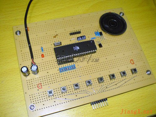 说明:由单片机的P1.0口输出音频信号,在P1.0口接三极管以驱动喇叭,最好用两个三极管构成达林顿结构。P2口连接8个一端接地的按键作为输入,当然也需要连接8只10K的电阻至电源作为上拉电阻。P2.0~P2.7依次为Do、Re、Mi、Fa、So、La、Si、Do(高)音。