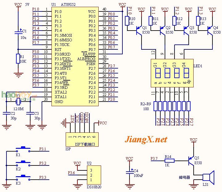 硬件设计: 电源电压VCC为5V,可以焊一只USB座到板上,然后用相应的USB线连接至电脑,通过电脑USB口供电;数码管选用四位共阳红色数码管;DS18B20也可以根据需要用屏蔽电缆引出来。K1为进入/退出设置键;K2为增加键;K3为减少键。电路原理图点击放大。