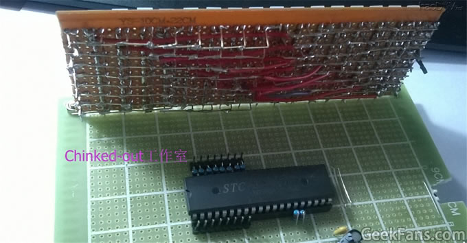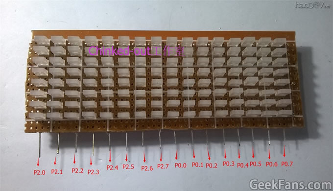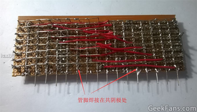 这样两个点阵就并联在一起了,由于是负极和正极并联,得以在程序上分别控制。此处没有什么好的方法,只能是跳线,我跳线比较凌乱,大家可以根据自己的想法跳线,只要符合前文叙述的规律就可以了。背面跳线如图7:
