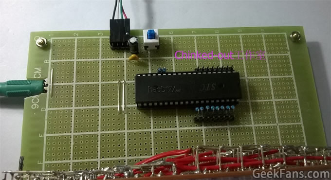 2、控制电路的焊接 由于STC15系列不需要外部晶振、复位电路,所以焊接好后的电路非常简单,在实际的焊接中,我把8只100欧的电阻焊接到了P2端口,原理图上是在P0,这个是无所谓的,因为这电阻只是一个限流作用,所以焊接在P2或是P0都可以。四个排针分别是VCC、RXD、TXD、GND,既可以供电,也可以下载程序。如图8:
