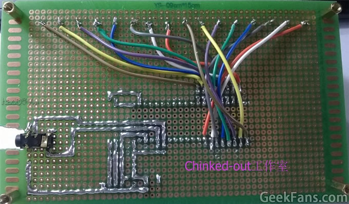 STC15系列是不需要外置晶振和复位电路的,所以元件只需要这么多。唯一要说明的就是3.5mm耳机插座,这个不同规格的插座两个声道焊点肯定不一样,工作室使用的是PJ-327A型,以此为例 9*15cm的洞洞板2张,废弃杜邦线(可用其他导线代替)若干 图2