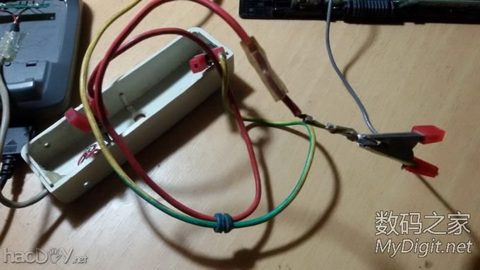 好了,废话不说了。看好电池的正负极,将充电的正负极与电池连接好,单节充电,这位说了,1.7V左右电池能冲吗?我只能告诉您,事实就是充电最多2分钟后,被充电池端电压可升至3.2V左右,4节电池都是如此。利用大头针插入电池正负极间的间隙,2分钟而已,大家要有耐心啊!