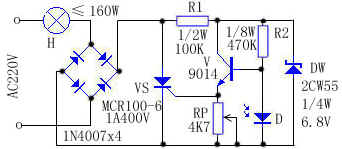 光控电子开关,它的“开”和“关”是靠可控硅的导通和阻断来实现的,而可控硅的导通和阻断又是受自然光的亮度(或人为亮度)的大小所控制的。该装置适合作为街道、宿舍走廊或其它公共场所照明灯,起到日熄夜亮的控制作用,以节约用电。 工作原理:电路如上图所示,220V交流电通过灯泡H及整流全桥后,变成直流脉动电压,作为正向偏压,加在可控硅VS及R支路上。白天,亮度大于一定程度时,光敏二极管D呈现底阻状态≤1KΩ,使三极管V截止,其发射极无电流输出,单向可控硅VS因无触发电流而阻断。此时流过灯泡H的电流≤2.2mA,灯泡H不能发光。电阻R1和稳压二极管DW使三极管V偏压不超过6.8V,对三极管起保护作用。夜晚,亮度小于一定程度时,光敏二极管D呈现高阻状态≥100KΩ,使三极管V正向导通,发射极约有0.8V的电压,使可控硅VS触发导通,灯泡H发光。RP是清晨或傍晚实现开关转换的亮度选择元件。 安装与调试:安装时,将装焊好的印制板放入透明塑料盒内并固定好,将它与受控电灯H串联,并让它正对着天幕或房子采光窗前较明亮的空间,避免3米以内夜间灯光的直接照射。调试宜傍晚时进行,调节RP阻值的大小,使受控电灯H在适当的亮度下始点亮。 ![]()
