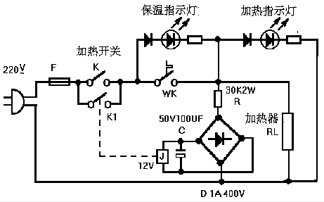 随着秋意渐浓气温逐渐降低,不少家庭都纷纷打开饮水机的加热开关,希望喝 到温暖的饮用水了。但是饮水机打开后加热罐内的纯水被长时间反复加热,不但不 利于健康而且还相当费电。在大部分时间里我们只需要饮水机短时间提供热水,笔者在不破坏饮水机外观的情况下增加了几个元件使饮水机具有省电功能。 饮水机背后都有一个船形的加热开关K,具有加热、断开两个位置。当K打开 后电源通过熔断器F、温控器WK加至电热管RL两端,同时电源通过电阻R降压、 整流桥Q整流、电容C滤波后得到15V的直流电压,使继电器J动作,K1闭合。如果此时将加热开关断开,电热管仍然处于加热状态,直至加热罐内的水加热到设定的温度,温控器WK断开,继电器J失电,K1断开,电路退出自保持状态,以后不再进行加热。继电器应选用动作电流较小的为好,可以防止电阻R上的功耗过大。 如果要进一步提高节能效果,需要对饮水机的加热罐作一些小改造,大多数饮 水机的保温措施很简单,仅仅采用两片预成型的泡沫塑料将加热罐围住而已,所以散热很快。最好能用聚氨脂材料(一般制造太阳能热水器的厂家有)在加热罐四周进行现场发泡填充,这样处理可以使保温材料和加热罐之间没有间隙减少空气流动可以大大提高保温效果。