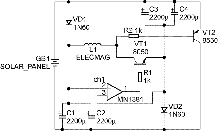 太阳能电池板 (2V×2 或 4V×1) 风铃宜选用日式江户风铃。这种风铃通体以玻璃制成,所以不会影响磁力线通过。同时外壳往往较大,可以比较容易在外壳上安装电路和太阳能电池板。而且江户风铃内部往往绘制有不同的图案,可以依照自己的喜好选取合适的款式。 电路图