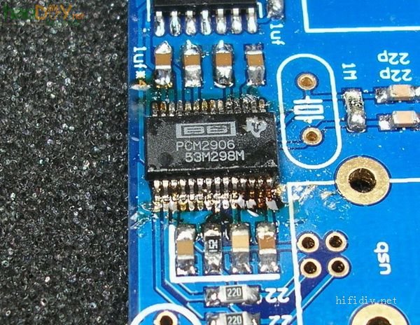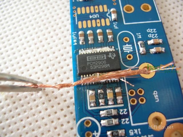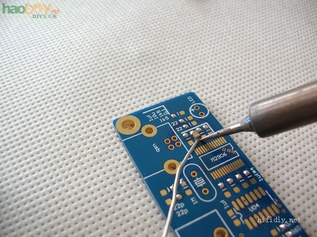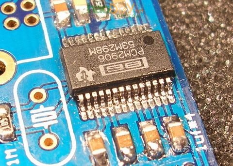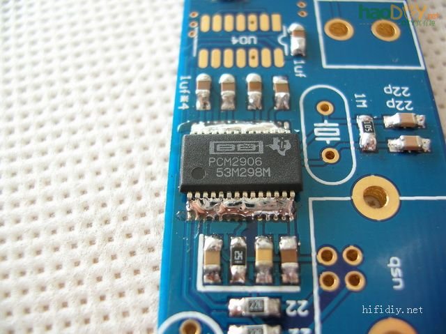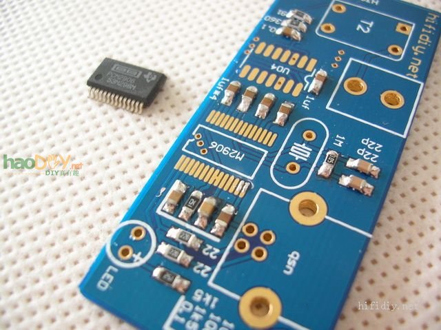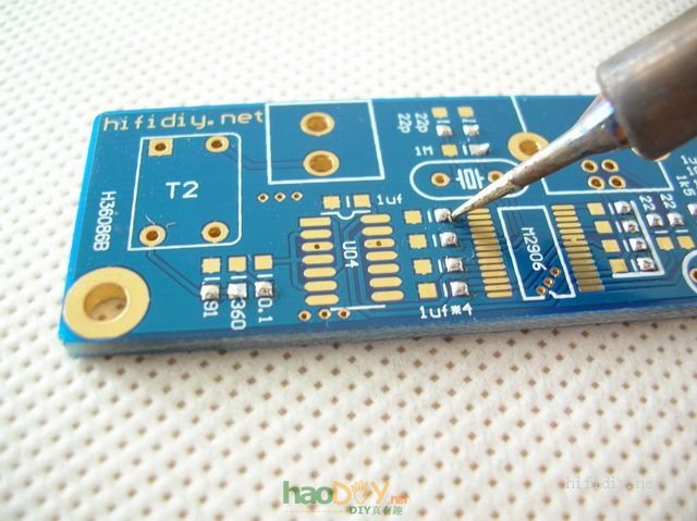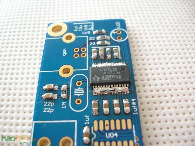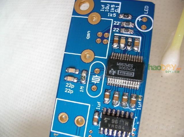 晕倒,最恐怖的IC到啦!这个DD比8414还小,太密集啦!焊接这个DD有很大的难度!仔细琢磨后觉得只能采用SJW38版主的方案!先在PCB上固定贴片IC的一个脚 然后大规模全部堆满脚!成了这个样子