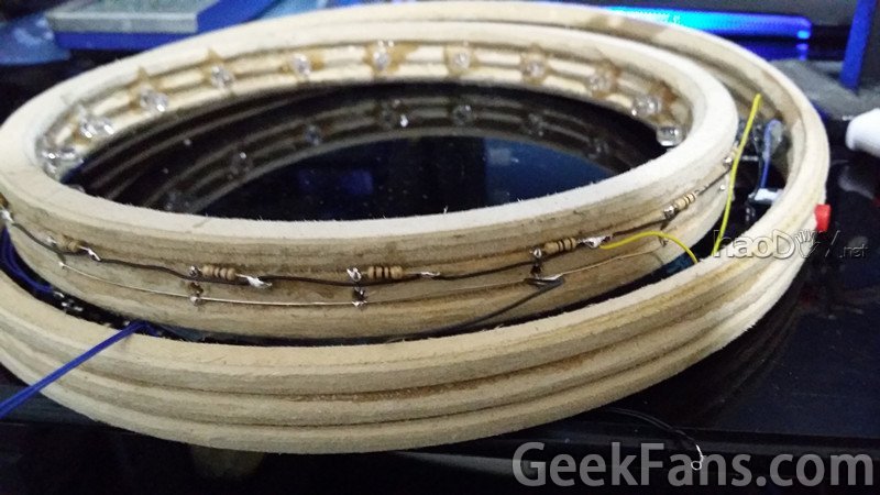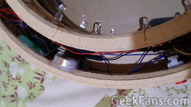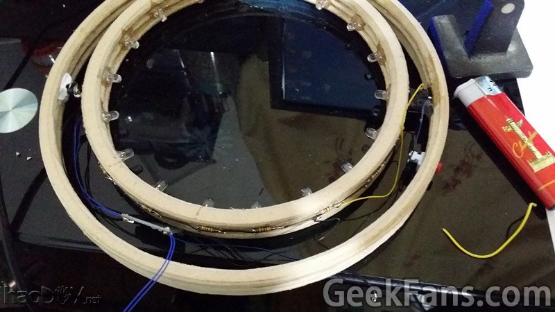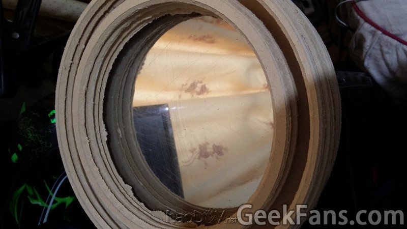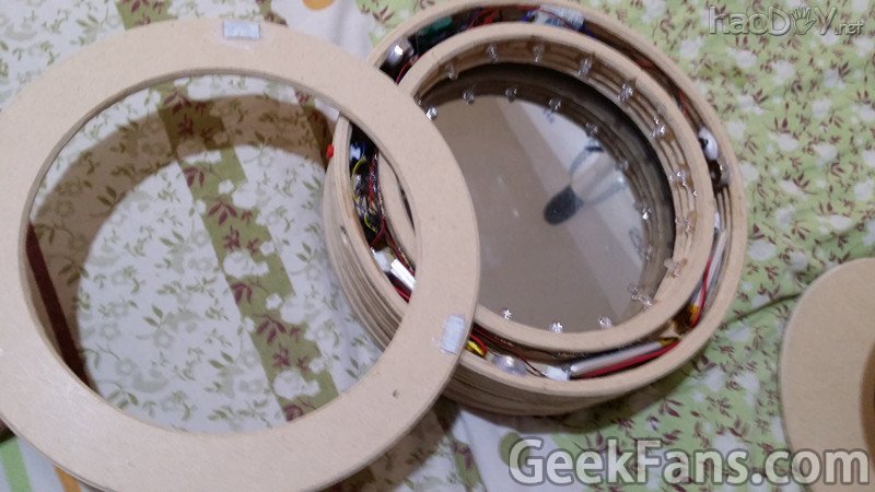 接下来把木板按顺序粘起来 最下面是普通镜子 中间是单向镜 最后是一圈led 然后布置电路部分