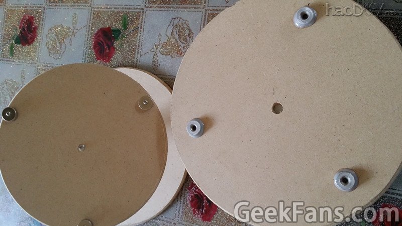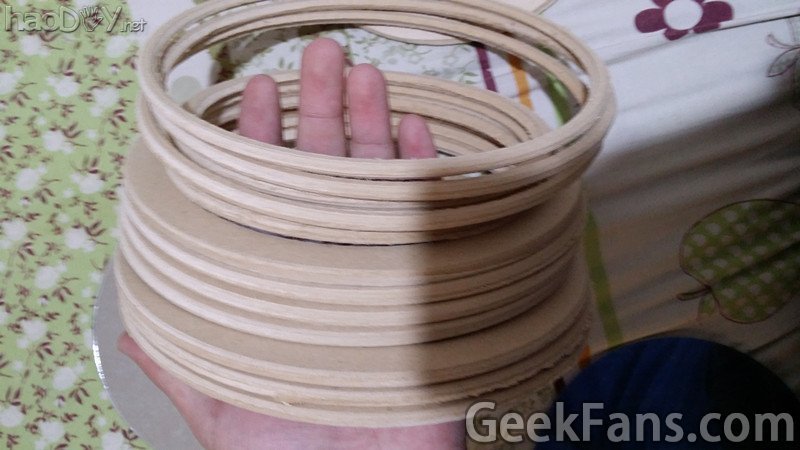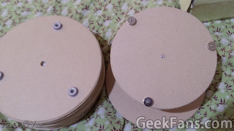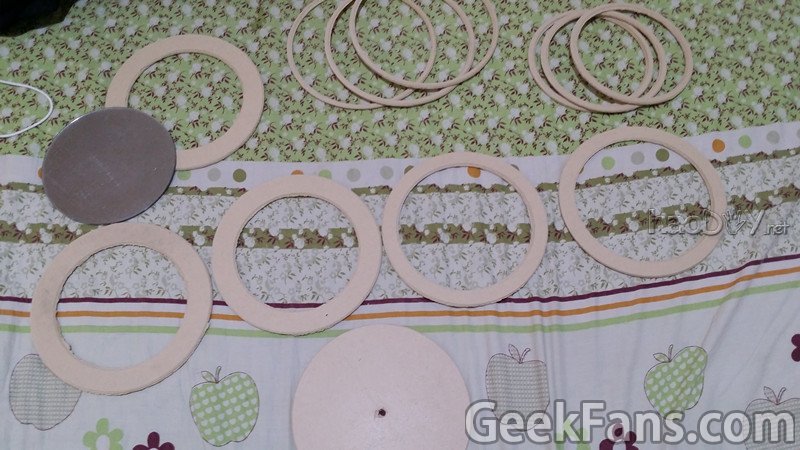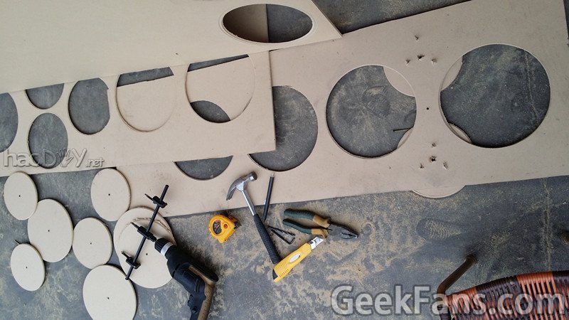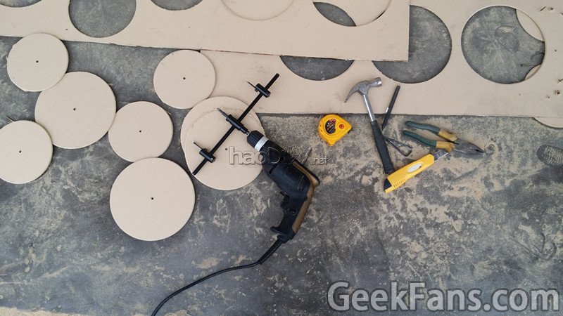 下面是主要步骤 先裁木板(我用的是木工开孔器) 裁很多圆形木板 还有很多圆环(具体就不细说了)