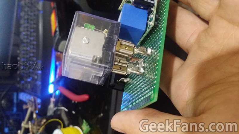 焊板 (这里用到大电流的地方我用吸锡带引了过去 焊继电器时可以把插簧戴上 放到板上合适位置然后按“贴片”的方式焊上去(我用的是双面板))