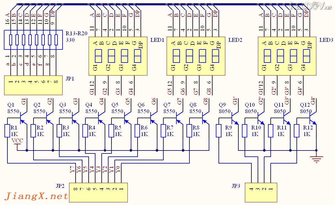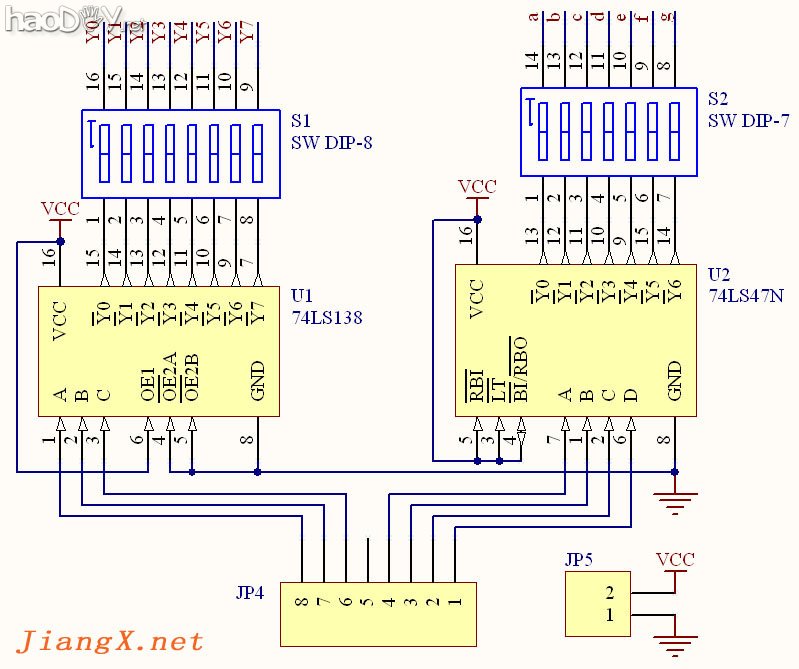 JP5为译码器芯片的5V电源接口,也为整个实验板供电。在拨码开关S1、S2拨到ON端的情况下,两个译码器都连接在电路中,应从JP4接口的高3位输入扫描信号,低4位输入显示数据段码。8位共阳数码管实验模块只需要7根线即可工作。