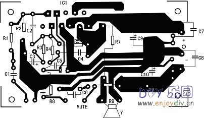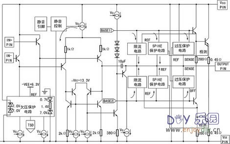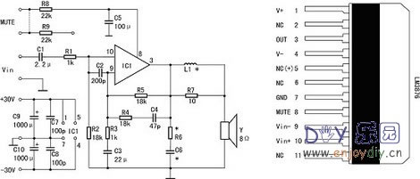 LM3886是单声道、中功率、高性能音频功放IC,是美国国家半导体(NS)公司的“序曲”(OVerture)音频功放系列具有代表性的IC之一。它采用11脚TO-220封装并具有输入静音功能,适合小型有源音箱、环绕声放大器和高保真立体声电视机等用作功放。 LM3886主要性能简介 1、连续平均输出功率: 60W/4Ω(Vcc=±28V) 30W/8Ω(Vcc=±28V) 50W/8Ω(Vcc=±35V) 2、瞬时最大输出功率: 150W 3、失真度:(THD+噪声)0.03%(20Hz~20kHz) 4、噪声电平: 2.0μV 5、信噪比:>92dB 6、互调失真:(按SMPTE标准)0.004% 此IC的最大特点是自身保护功能齐全,无须外接各种保护电路,它内含NS公司研制的SPIKe(自身瞬时温度)保护电路,对输出级晶体管的安全工作区(SOA)进行动态检测与保护,从而全面实现过压、欠压、过载、输出短路(包括短路到地与短路到电源)、热失控和瞬时温度冲击等保护功能。附图1是3886内部等效电路。 电路工作原理简析 R2为LM3886的同相输入端提供偏压;并联在两个输入端的C2是用来减小放大器的高频增益,以免输出管出现振荡,同时抑制输入的电磁干扰噪声;R5、R4、C4组成反馈回路,放大器的低频响应和高频转折频率fH取决于R3、C3;R4、C4、R5和R3决定高频增益和低通转折频率fL(fH、fL的计算公式略)。 C4是补偿元件,它与R4、R5共同起减小高频增益的作用。 R8、R9、C5与开关(图中虚线所示)组成静音控制电路:当开关断开时,LM3886停上输出,即静音起作用;接通开关时静音解除,R8将⑧脚输出电流限制到0.5mA(LM3886的⑧脚电流≥0.5mA)。C5为静音通、断提供较大的时间常数。 R6、C6的作用为防止放大器产生高频振荡。 L1、R7作用:如果负载呈容性(如扬声器电缆较长),则放大器在高频下会过载,并使方波响应出现转折,为避免此现象,在输出端串入LR组成的并联电路,此时L呈现较大感抗,10Ω电阻将放大器与容性负载隔离开来并降低L与容性负载所构成回路的Q值;低频下则10Ω电阻被L短路,放大器通过感抗很小的L直接驱动负载。 自制中几点注意事宜 本文介绍的150W Hi-Fi功放电路见附图2所示。由于该系列IC的引脚彼此兼容,故附图3 所示的印制电路板既可安装LM3876(50W),也可用来安装LM3886(150W),为此,在电路板上IC1的⑤脚接到电源,以适合LM3886,而在安装LM3876时,由于⑤脚是NC端(内部不连接),故仍然适合。 为了取得最佳性能,用C7~C10对电源进行退耦,并对电路板的所有地线进行一点接地;IC1装在电路板的一侧,以便于把它固定在散热器上,散热器的热阻小于1.5kΩ/W。 空芯电感L1可用1mm漆包线在10mm胎具上绕13圈脱胎而成;电阻R7装在L1里面,并将它们的两端并联焊在电路板上。 本电路的MUTE端接上一只开关,当开关断开时,ICl即处于静音状态;若不需要静音,则应在MUTE端焊上一段短路导线。R6~C6用来改善放大器的高频稳定性,通常可以省去,但最好还是加上。 LM3886(或LM3876)的最佳负载是8Ω,如果用于4Ω负载,则当电源电压下降到27V左右时,IC1内部的SPIKE保护电路将起作用,使输出功率减小到10W左右。因此,所用扬声器的阻抗最好不要小于8Ω。 (责任编辑:admin) |