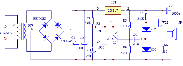 用稳压集成功放制作的功率放大器,对电子爱好者来说,作为开拓思路的一种尝试不无积极意义。该电路为纯甲类工作,又用低噪声管作电压放大,所以THD,NF等指标都不错,输出功率可达到30W 电路如图所示,晶体管VT1作为电压放大,因稳压集成电路IC1的输入阻抗高,故其工作电流只需0.6mA就足够了,R1,C3为电源退耦,C4用于防止寄生振荡,R3、R4分压给VT1提供偏置及交直流反馈,以改善线性及直流稳定性。VT2、R5、R6及二极管构成恒流源,用来提高电路的效率及输出功率,增大输出动态范围。 由于电路特别简单,故元件可以搭焊,恒流源的恒定电流可设置在10~15mA,调试时将LM317的输出电压调整到电源电压的一半即可,静态电流约为十几毫安。电源变压器T1功率不得小于50W。 三端稳压IC选取LM317,三极管VT1选取9014。VT2选用8050型,二极管VD5、VD6选用2CP20,变压器的功率应大于50W (责任编辑:admin) |