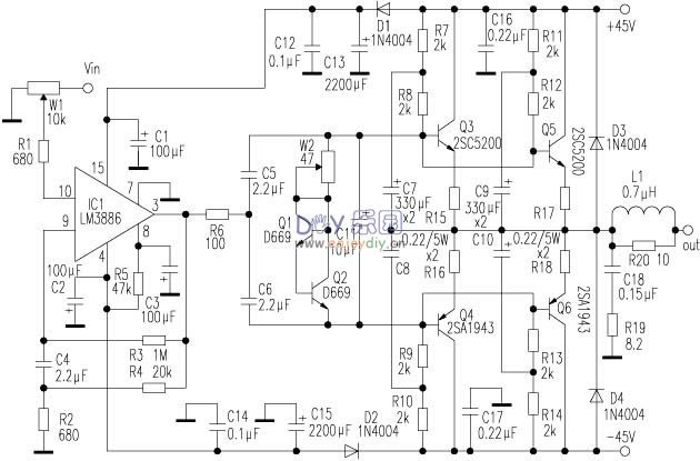电路原理见下图。该款功放的末级电流放大电路未介入环路负反馈,有效地抑制了瞬态互调失真(TIMD)、界面互调失真(IIMD)和相位互调失真(PIMD)等,改善了高音域的层次感,减小了“音染”。在这里,摈弃了LM3886的典型应用电路,而采用无源中点伺服反馈模式,这样一方面可对LM3886{3}脚电位进行伺服校正,使之始终保持在0V左右;另一方面可将互调失真降至最低限度。 图中,W1为音量电位器,R1为平衡电阻(即匹配电阻),C1、C2为退耦电容,安装时要求靠近LM3886的正负电源的引脚处,否则极易引发低频振荡。D1、D2为隔离二极管,其作用是使大动态性能得以改善。当输出级瞬间大动态信号电流使电源电压下降时,由于D1、D2的反向隔离作用和滤波电容C13、C15上的电压不会突变,LM3886的电源电压便基本保持不变,此时C13、C15相当于一个备用电源向IC1供电,待电容上的电压下滑时,输出级的瞬间电流峰值已过,电源电压复原,接替C13、C15向IC1供电;当动态较小时,IC1的供电仅比电源电压小0.7V,其不良影响完全可以忽略。Q1、Q2、W2构成恒压偏置电路,调节W2可改变输出功率管的静态工作电流。R7与C7、R10与C8、R11与C9、R14与C10分别构成RC滤波器,使输出功率管的基极能获得更纯净和稳定的偏流。R7、R10、R11、R14是隔离电阻,其作用是使C7与C9的正极、C8与C10的负极的电位摆脱电源电压的钳制而处于可浮动状态,以便校正输出功率管的工作状态,改善音质。R15~R17是输出功率管的射极电阻,为输出功率管提供较强的直流负反馈(亦存在交流负反馈),以稳定输出功率管的静态集电极电流,防止热失控。D3和D4为保护二极管,限制输出幅度最大为电源电压,避免了因输出电信号幅度高于电源电压而损坏输出功率管的情况。C18和R19构成贝茹尔网络,用来抵偿扬声器的感抗部分,限制高频输出阻抗,令其保持在8Ω范围内,使功放接近纯阻性,不易自激。R20是阻尼电阻,L1为高频扼流圈,可吸收扬声器产生的反峰电压和抑制超高频电信号送进扬声器。 安装时要求将Q1、Q2与输出功率管装在同一块散热器上,以保证温度的稳定性。调整时,不接扬声器,将W1、W2调到最小位置,检查无误后,接通电源,用万用表测图中out端的对地电压应在±20mV以内,否则就得适当调整偏置电阻。根据散热器的具体尺寸,调节W2使输出级工作于甲乙类或甲类状态即可。 (责任编辑:admin) |