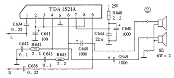 由图2可看出,它在此应用中是采用+22V单电源供电(OTL工作方式),电视伴音的R、L信号经C634、C636电容耦合到了TDA1521的①、⑨脚,进行功率放大,③脚电压等于电源电压的一半,即11V左右,故③脚经100μF电容交流接地,同时③脚与②、⑧脚相连,提供约11V的偏置电压,④、⑥脚外接隔直耦合电容C649、C648,容量在470~1000μF,影响低频响应特性,④、⑥脚串联电路R642、C642、R643、C643为RC幅频特性补偿电路,⑦脚外接的R640、C644为电源RC去耦滤波电路。