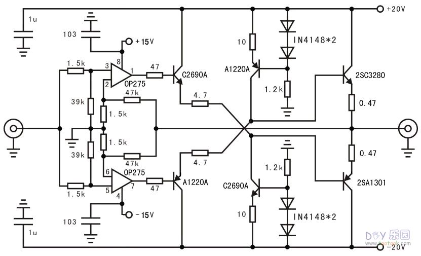 OP275运放+2SC3280(2SA1303)功率放大器电路图![]() |
