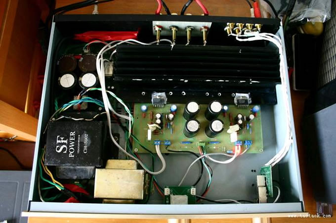 手上有机箱、散热器、变压器等一些闲置的东西,只差板就可以动工了。 一天到电子商场买配件,无意中看到这块板,标明写着:北京吴刚3886。 这个名气很大的,何不试试看。问了一下,只剩最后一块了,上面还有不干胶的痕迹。不知为什么,有一种想动手的冲动。于是买下了,13元。 顺便买了些配件,基本上齐了。 晚上把阻、容焊好。 第二天把3886焊上(板上有个元件印刷不清,搞了半天才明白,这个以后再说)。 试好电源、喇叭保护器(带滤波电容):电压为40伏。 接上板,开机三秒钟后关机,无异味。重开,测中点电压,右边接近0,左边2。3毫伏。 接高音喇叭(串电容保护),无声,还以为是故障。其实是噪音太低了,开最大认真听才能听到一点。 加信号,出声。 再测中点,正常。接音箱,正常。 一听就喜欢,是我喜欢的声音。 下一步就是调整RF1和RF2了。 1K到10K的电阻买了一堆回来,为了调较方便,用分色纸贴好标签(图片中的四个怪物)。 开始调较,没有任何仪器,只好用耳朵听,实在不是金耳朵,听来听去差别不大,觉得RF1为1K、RF2为2K时最好。 电源部分 板子上的整流不用,滤波电容为4个4700的音响专用,外板再加两个6800和两个10000的,并0。1 感觉用不了那么大的滤波电容,在板子上也不算了。 输出为正负40。5伏,是否接近3886的上限?反正温度也不高,声音也好,散热片也不小,估计问题不大。 变压器为拆机的方型,上面标着3002,其他没标志了,功率大小不知,小的那个是扼流圈(没必要用吧)。 整流桥是6A的,拆机品。 |