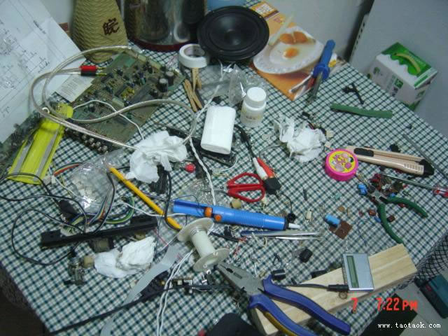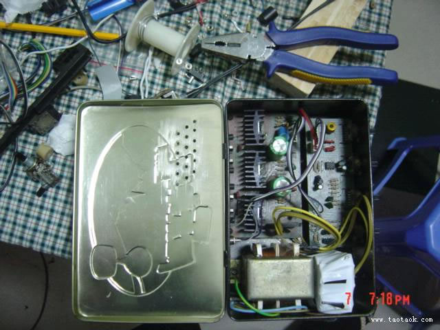 新组装的(应该不能算做的)2.1功放用一个旧的功放环绕部分功放和音调模块组装的,帮楼下同事做的,贿赂贿赂他,将来不会在我开炮的时候来敲门,呵呵 裸体全貌,用糖果盒子做的机箱 功放是tda2030A,原来的全坏了,都是换新的。原电路是三个相同声道,做后环绕的 ,我把其中一个加入滤波网络,改成重低音了 变压器是亲自绕的,双12V的,没有浸漆,用透明胶的,非常不专业,见笑了 输入 散热孔,用小电钻转累死我了 电容阵列哦,10个2200的电解,呵呵,包起来是因为机箱太挤,怕碰到别的东西 前面板,依次是电源开关、低音、高音、重低音(原来的板子是平衡)、音量,该有的都有了,呵呵。平衡电位器,我用个微调移到里面去了,反正很少用到。 上面看看,喷了黑漆,看的出来是什么糖吗 屁股 则面,这是我家厨房,我的厨房是绿色的,靓吧 工作台,也是餐桌,好几天没开锅了 (责任编辑:admin) |