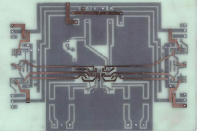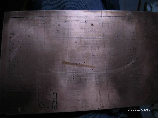 回家后把板子两面都用砂纸打磨光亮,然后开始设计布线,线路图用的是论坛夏兄的,不过稍做了改进,弄成可以搭配平衡前级的电路.