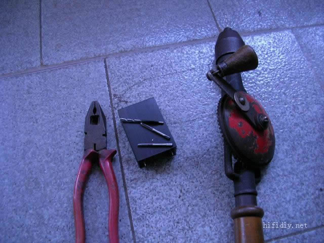 我用的工具是手摇钻,2.5mm钻头,和3MM的丝攻,在打孔前,打好记号钻孔的地方一定要用钉子的尖锐的的东西定个眼,以防打偏,打好后将丝攻用手旋入一些,我没有绞手,就用钳子了.在攻的时候记得放点油这样速度快,也不易弄断丝攻.