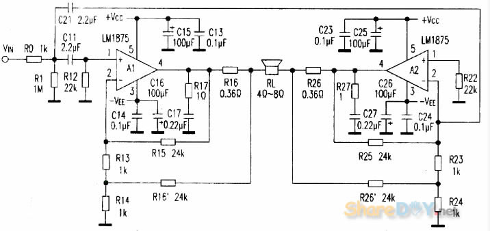 LM1875功率放大器电路简单,音色优美,具有胆机音色.用其制作的功率放大器,在正负25V电压下输出功率可达25W