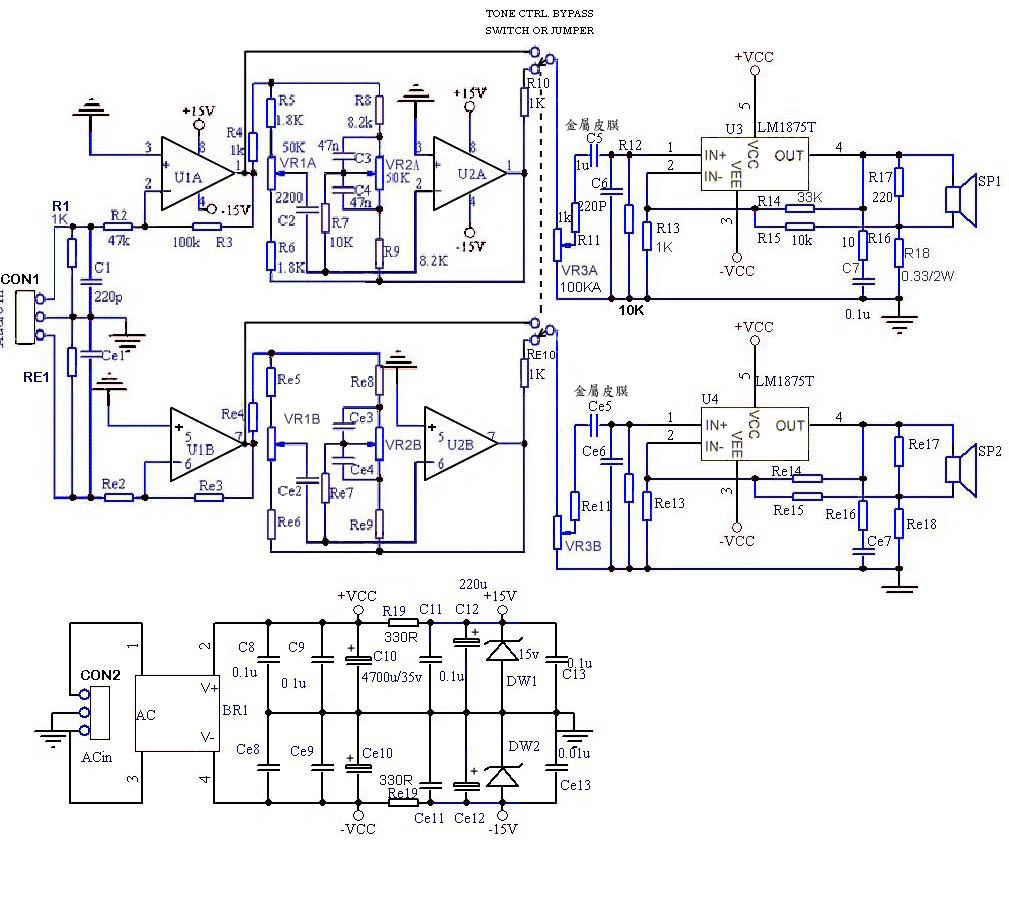 考量小功率、電路簡單、最好含音控(有些人好喜歡有音控的後級)、成本低、DIY容易(最好能給一些高職或專科電子科的新手實習,打完分數後還會想把它帶回家)…. 想了好久,我看定位在20W~30W之間好了,也到網路上比較了好多電路,最後選擇了LM1875這個功放IC的電路,巧的是,看了看還是對岸松勝的電路看來最好,評語也不錯,但我個人想比較一下不經音控的真實音效效果如何,所以為它加上了音控Bypass的選擇。