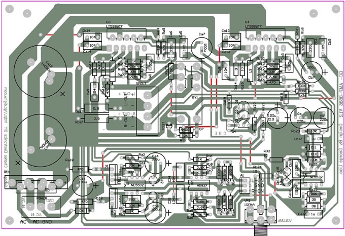 前 言: 計劃製作一個功率放大器已有一段時間了,為了方便設計選擇以 LM3886 功率IC為基礎,但總覺得不能太簡單只是照著技術文件的內容來的製作,所以在網路上搜尋了不少的文章及電路,發現LM3886也可以加上DC SERVO電路,所以我把LM3886 + DC SERVO + OP 前級 + 喇叭保護器 +電源一起設計在一片板子上,使製作的難度降到最低。(,原圖參考大陸網站[松勝電子]) LM3886TF是美國NS公司推出的大功率音頻放大IC,其後面的TF為全絕緣封裝,也就是安裝散器時不必再加雲母片來絶緣,在額定工作電壓下最大可達68W的連續不失真平均功率,具有比較完善的過電壓、過電流、過熱保護的功能,最可貴的是它具有自動抗開關機時的電流沖擊的功能,使喇叭能夠安全的工作。 LM3886優異的性能,使得它在近幾年音響製作中廣泛的應用,許多成品功放機中就有直接的應用它擔任後級功放或者用它作為重低音放大電路。其特點有︰輸出功率大(連續輸出功率68W)、失真度小(總失真加噪聲<0.03%)、保護功能(包括過電壓保護、過熱保護、電流限制、溫度限制、開關電源時的揚聲器衝擊保護、靜音功能)齊全,附加零件少,製作調試容易,工作穩定可靠。由於用它製作功率放大電路具有簡易,適用的特點,特別適合發燒友以及電子愛好者的製作。 LM3886TF的特性如下︰ LM3886在VCC=VEE=28V、 4歐負載時能達到68W的連續平均功率,在VCC=VEE=35V,8歐姆,負載時能達到50W的平均功率。 具有較寬的電源電壓範圍VCC+VEE為20V-94V; 總諧波失真+噪聲︰60W 20Hz<f<20kHz AV=26dB 時的值為 0.03% 轉換速率(SLEW RATE):VIN=2.0VP-P、tRISE=2ns 時的值為 19V/us 總靜態電流︰50mA 輸入偏流︰ 0.2uA 增益帶寬乘積: 8 MHZ 電路圖如下: ![]() ![]() 電路分為幾個部份: 電源供應: 由電路圖中可看出,電源供只是一般基本的設計,由於LM3886的供電範圍非常的廣,所以建議使用次級為AC( 22V ~ 0 ~ 22V)至AC(28V ~ 0 ~ 28V)之間的變壓器,我用的是(AC(24V ~ 0 ~ 24V),的變壓器,電流最好大於3A(或200W以上),如果能用環型變壓器效果當然更好。 OP前級及DC SERVO電路所使用的電源供應: 為了達到更好的音響穩定度,供應給OP前級及DC SERVO電路所使用的+-15V電源也加上SERVO電路以避後級電流變動時可能發生的壓降,自然前級的穩定度必定增高。 前級放大: 前級也是使用OP來擔任,為基本的DC放大電路,設定為10倍的放大倍率。為了方便大家更換自己喜歡的OP來調音,建議製作時,這個位置先焊上IC座,以便日後更換自己喜歡的OP。 後級放大: 採用了美國NS公司(國家半導體公司)推出的高傳真音響功放積體電路LM3886TF作功率放大,用運放NE5532或AD827作前置線性放大。 DC SERVO電路: 眼尖的高手可能看出本製作除了使用OP來執行DC SERVO的任務,另外LM3886所使用的純電流回授電路和一般用法有所不同,這是在網路上看到專家經過反覆測試改進後的電路,值得介紹給大家。 喇叭保護電路 一般功能不多介紹,此保護器能在功放輸出不正常的直流時,和使繼電器斷開與喇叭間的連接,以保護它不被大量的直流電流燒毀。 以上只是簡單的對這個電路介紹,想瞭解全部動作解析的話,就要靠各位自己上網爬文了。 有關直流功放的特色: 另外其實這個電路是純直流的設計,因為一般放大器與訊號源的交流是透過電容來阻隔直流電,但電容本身的特性卻可能影響頻率響應,或不良電容所產生的雜訊進入放大電路中,不知多少發燒友在尋求最好的交連電容,其實最好的交連電容就是不要交連電容(網路上常有一根銅線代替電容的討論),本電路即然稱為純直流的功率放大器為何還有C5的存在呢? 其實C5是可以完全拿掉的,也就是直接短路電容兩端,拿掉電容,直接用跳線取代,因為本電路有完善的DC SERVO的電路來確保電路沒有直流輸出,就算真的不小心輸出了直流也還有最後一道防線-[喇叭保護電路],如果你還不放心,那C5就留著吧! 零件的選用: 為了成本考量,我製作這個電路並沒使用高檔的發燒品,如WIMA電容等….,但並不表示用了最便宜的零件,但並不諱言,零件的穩定度影響電路的品質,所以採C/P值高的方式安排零件,我的製作使用了1%誤差的精密電阻,必要的地方也使用了較高檔的金屬皮膜電容或是鉭質電容,試聽之下,實在滿意,在聽感上中、高頻纖細耐聽,低頻繼承了電流回饋的下潛深而有力的優點,實在可以說是不錯的組合,希望大家能製作成功。 製作需注意事項: 一般市售的感光電路板的銅鉑厚度較薄,所以如果可能,在焊鍚的時後,在後級電源經過的部份銅鉑,可以加上一層焊鍚,以加強它的電流能力。 散熱片的安裝並不是製式的規格,所以固定散熱片的方式請自己動點腦筋,大小也不要小於我所用的,你們可以對照一下照片,LM3886TF封裝是全塑膠的,不用雲母片來絶緣,但最好以散熱膏塗抹於接觸面,再以螺絲固定。 以下是部份製作時的照片,供各位參考: 以下↓電路板已多次改版,以最下方的電路板為準,舊版本的一樣保留在章章內供參考。 電路板圖樣及零件配置A如下:(舊的LAYOUT會有啍聲,儘供參考) ![]() 修正LM3886-SVO純直流功率放大器有低頻哼聲的問題: 部份網友在DIY站上LM3886純直流功率放大器後,跟我反應,在沒有音源輸入,且音量最小時會聽到微小的哼聲,站長把自己DIY的板子再試看看,先把我那很吵的冷氣關掉! ,真的有網友說的哼聲! 夜深時更為明顯..... 問題出在那裡? 反覆的檢查,電路板跟電路吻合,電路沒問題,所以想想會不會是電路板在