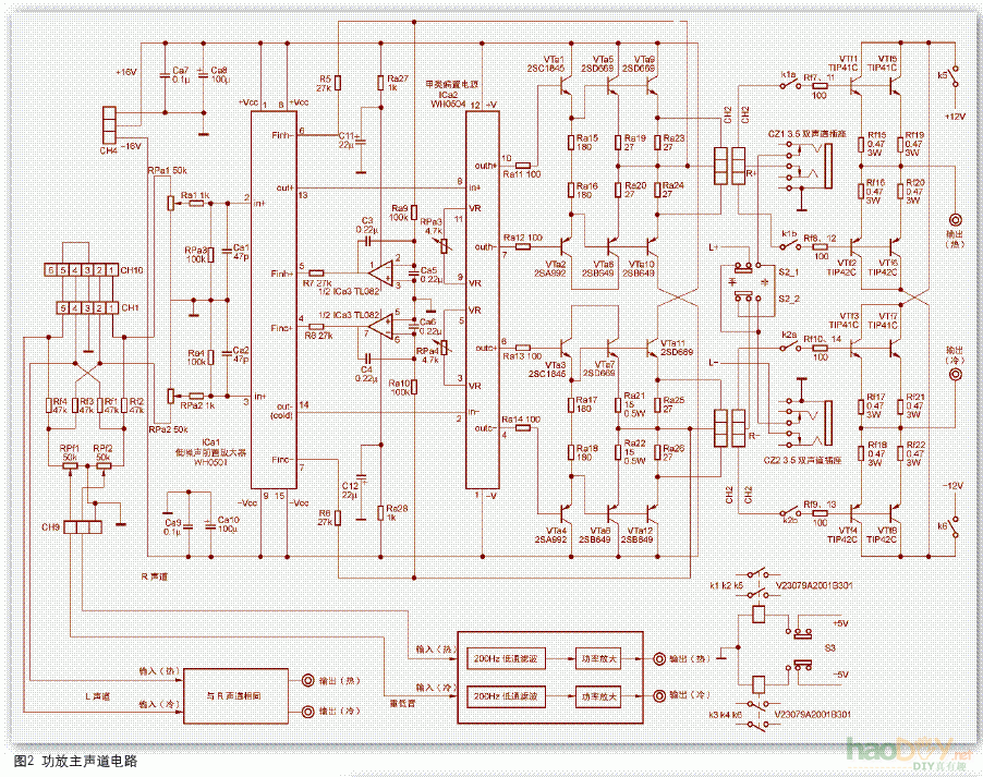 信号输入部分电路如图1所示,S1 是非平衡/平衡转换开关。平衡信号通 过XLR-5接口®S1®CH10,非平衡信 号通过RCA接口®ICc1、ICc2转换为平 衡信号®S1®CH10。 功放主声道电路如图2所示(图 中只画出一个声道)。输入信号通 过 音 量 电 位 器 进 入 低 噪 声 前 置 放 大器ICa1(WH0501)放大后,经 VTa1~VTa12推动管送入VTf1~VTf8作功 率放大后输出。ICa2是甲类偏置电源 (WH0504),为推动管提供基极偏 压。ICa3是直流伺服电路,误差信号由 ICa3检出后送入输入端,实现输出端 的平衡控制。开关 S2 对耳机输出信号 实现平衡/非平衡转换。平衡输出一组 立体声信号,非平衡输出两组立体声 信号。开关 S3 控制6只继电器,实现 "耳机"与"扬声器"转换。在听耳 机时关断末级功放管的基极输入信号 和集电极工作电压,同时关断重低音 电压,降低交流声和噪声对耳机输出 信号的干扰。末级推动管是两级射随器构成的复合管,第二级射随器又由 双管并联,以减小单管的工作电流, 提高输出信号的线性,降低开关失真 和交越失真。图2中的Rf1~Rf4将输入信 号整合成单声道平衡信号,经电位器 RPf1、RPf2送入重低音处理电路。 噪声前置放大器WH0501、甲类偏 置电路WH0504是乾渊电子科技研究所 研发的混合电路模块。
