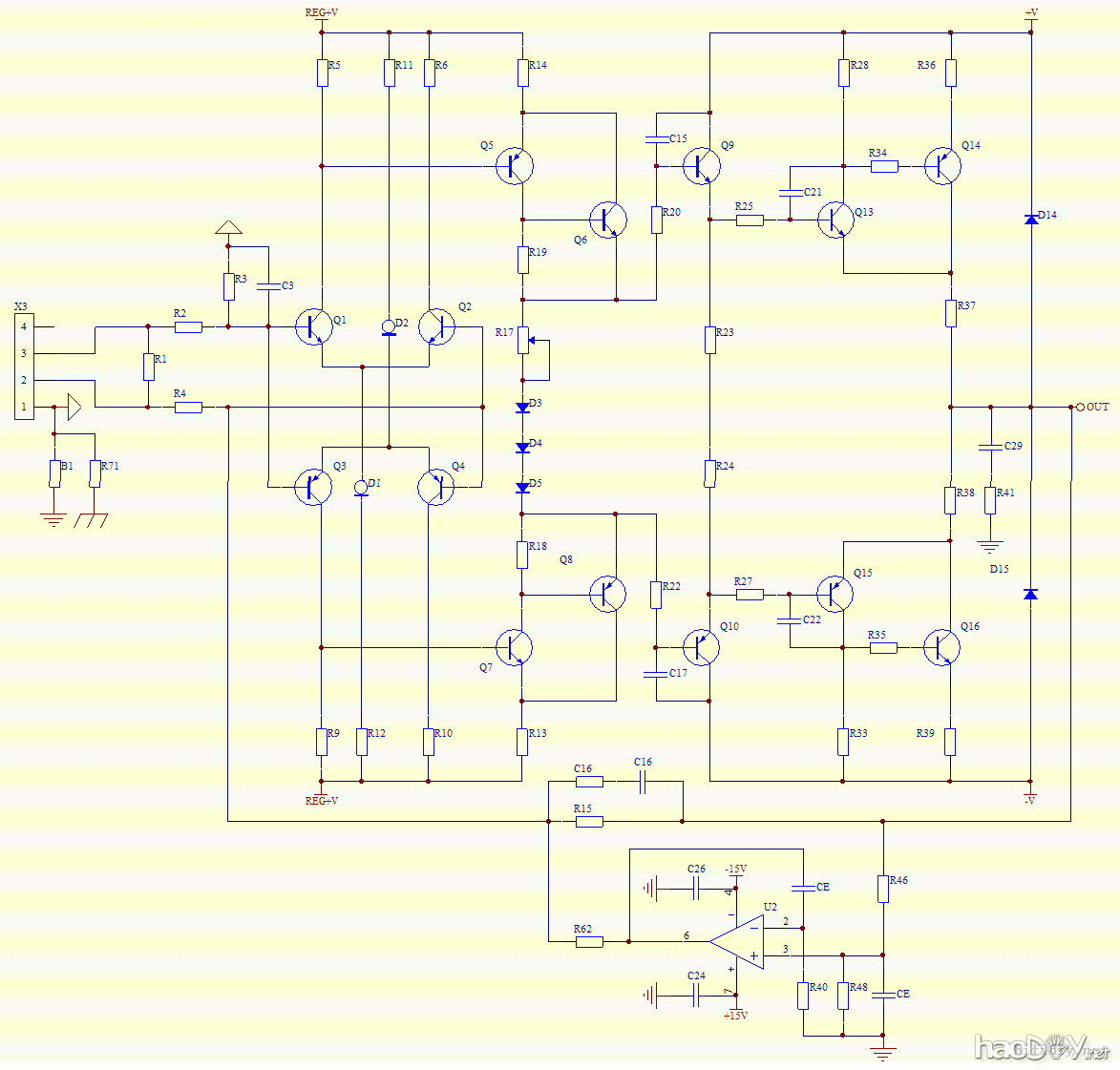 Q6 Q8为TO126封装的中功率管且使用较大的静态电流提高动态时C15 C17的充放电速度,