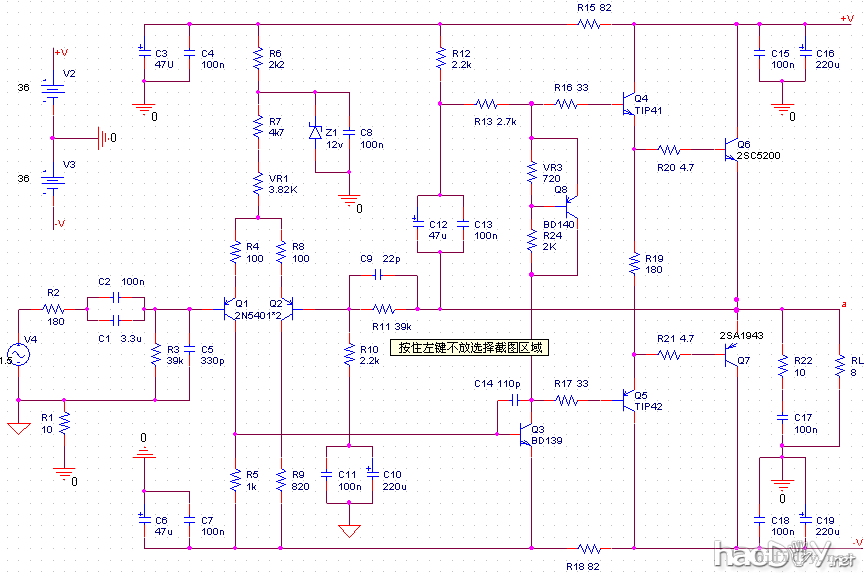 差分放大后送放BD139的VAS(电压放大级),非常简洁,在这里提一下国外很多人对“simple is the best"-简洁至上的理解,他们在设计一个电路的时候,会尽量使元件最少化,先提出比较全面的电路,再试着去掉一个元件,听感,如果有变化则保留,如果没变化则将这个元件永久去掉!这一点在这个电路的VAS级体现得非常明显,呵呵。简简单单,看起来也很舒服!相伴补偿电容C14在这里是不可缺少的,原图取值24-27pF,我的测试结果与分析显示须在100pF以下才有得保障,于是,取值110,舍我取谁 C12与R12组成自举电路,C12将输出点电压举高,用经保障三极管的静态工作点,减少开环过程中的非线性失真,R12的引入防止交流短路。 BD140与两只电阻组合起来控制末级电流放大管的静态偏置,经典适用。后面的电流放大级没有射极输出电阻!这个很特别,原理很简单,不过也很容易出问题。因为当5200/1943发热的时候,管子的导通电路会降低,继而电路加大,于是管子进一步变烫,恶性循环,管子必烧!常见的电路采用射级电阻可以相当程度的避免这一情况,当电流变大的时候,在射极电阻上的压降会加大,从而起到局部负反馈的效果。但这个电阻其实会很影响音色的。去掉它后,虽然会带来烧管子的危险,但无论在速度还是在定位上都能更上一层楼! 使之安全的方法是控制温度效果,我在实践的过程中做了两个工作,结果表明可有效的控制电路的输出级电流。工作一:将BD140直接与功率管5200固定在一起,让BD140跟着5200的温度一起变;工作二:将TIP41C/42C加个小散热片,控制这两个家伙的温度先! 害怕的也可加一个射极电阻,约0.2欧姆左右,另外如须并联输出功率管当然也须增加相应的射极电阻以平衡各并联管。 电源采用正负36V供电,整机在8ohm喇叭下可达到50W功率,4ohm喇叭下可达100W功率。 在此推荐我之前帖出的电源电路,其实是在DX设计的电源上小改而成,很简单效果也很好。点我链接