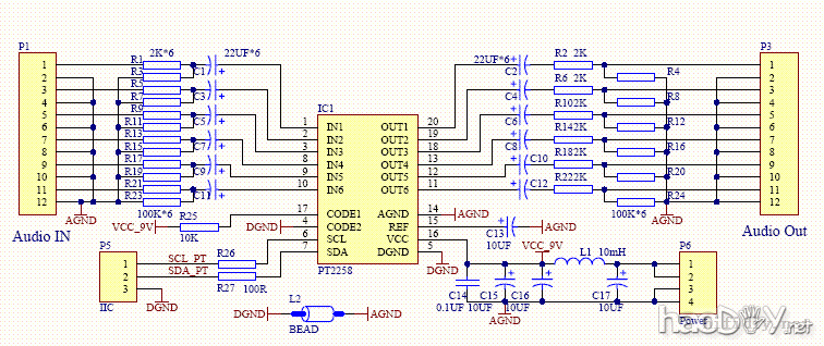 电子音量控制使用普诚公司的PT2258 六通道电平衰减芯片,采用IIC串串行控制。芯片的功能请参考规格书。