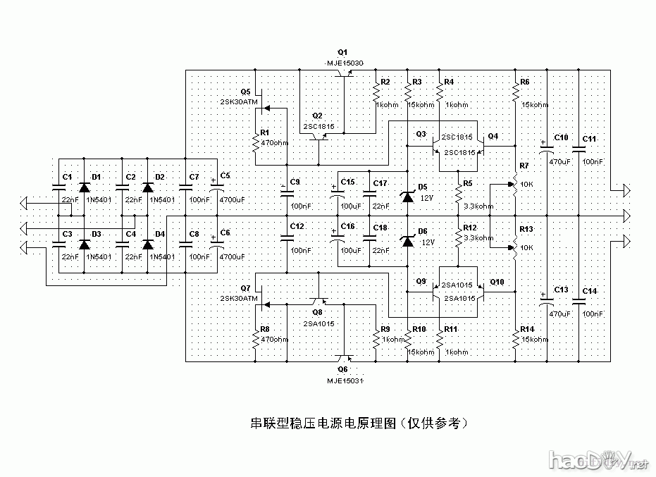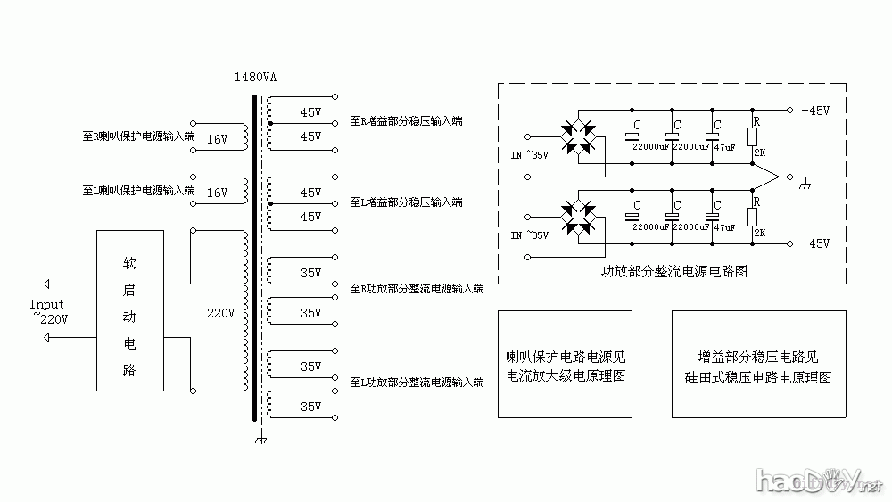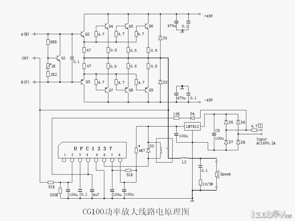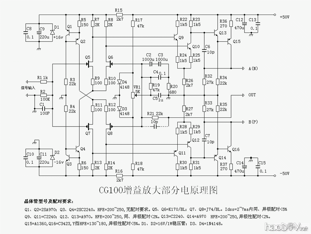 我这次参赛作品是一台采用JEFT输入全对称放大的100W纯甲类功放,是一款自己设计的电路,从电路的构思,PCB设计和不断的改良,到制作的完成足足花掉了近两年业余时间。 我将按以下几个主题来自我介绍一下整台机器的制作和调试过程。 一、放大电路电原理图和电路介绍及PCB图样。 二、机箱构造和特点。 三、电源系统的组成。 四、电路电气性能的各项测试汇报。 五、实际的试听总结 放大电路电原理图和电路介绍及PCB图样。 (注:以下电路未经作者同意,不得擅自作商业应用,如需转载请注明出处) 熟悉Kerll100MK2电路的朋友可以看出,下图中增益放大部分的各级工作程式相当接近,但第三级主电压放大级与Kerll是完全不同的,前者惯于使用两级达林顿放大获得较高的开环增益,较高的放大系数亦可以提高这一级的输入阻抗,而我在第二级差分与电压放大级之间加入了一级射随放大电路作耦合,可在多级耦合的电路中,有效避免寄生振荡。获得较高频宽放大性能,既有较高的输入阻抗,又有较好的热稳定性,如工作环境温度升高时Q15的BE结电压变低,使得其工作电流升高,恰好Q13也同时受温度影响同样其BE结电压降低形成互补,使Q15稳定的一个工作点上。Q13与Q15的结合形式,我们不妨回看下,音乐传真机器上都有采用的。CG100增益放大电路各级采用较深的直流负反馈,其开环增益并不算高,这样可有效的避免高负反馈带来的瞬态互调失真,达到HIFI要求。只是简单的“吹吹”,我就不在众位高僧面前班门弄斧了~ ![]() 增益放大电原理图 ![]() 功率放大电原理图 ![]() 增益放大板PCB截图 ![]() CG100AMP面层 ![]() 机箱构造和特点 整个机箱尺寸为:48.5(宽)X56(长)X32(高);整机重量为:54KG(包含约15KG的电源组件);有效散热面积4.3平方米。 ![]() 机箱为全铝结构,除面板外,所有的加工均由手工完成。两翼散热器每边由4片14X30X6CM的梳子状铝型材并合而成,型材的基板厚度1.4CM,装好均热板和角铝后已经达到了16KG每边,由于整机的个头太大,要随意搬动它不是件容易的事,在整个制作过程中,围绕着方便在往后的维修过程中不需整机解体就能完成,经过了好多次构思,决定搞成积木式并装机箱,把左、右声道散热器和电路,牛和整流滤波分成三个大体(件),这可以事先分别对各个声道电路调试完毕后再组合成一个整体。看下图 ![]() 前面板由一块厚1.2CM,尺寸为48.5X32铝板加工而成,重达5KG,折合面积0.32平方米,单是它足可应付一台10W小甲了,为了充分发挥散热效能,在制作时有意识地将其紧固在散热器上,并在贴缝间加有一层导热硅橡胶绝缘垫,获得更紧凑的热传递,看下图 ![]() 电源输入插座,开关和保险座都集中在后面板上,没有较多的引线与电源整流组交联,只有两根线引入电源软启动板上即可。 ![]() ![]() 继续上传些在装配过程中拍下的图片 ![]() ![]() ![]() 还有我朋友在故意搞怪的图片 ![]() ![]() 将近年末,又到为领导准备“吹泡泡”材料的时候了,自己倒没时间上来更新贴子,在此向各位跟帖的朋友们Say sorry。继续~ 三、电源系统的组成。 本机使用的电源部分跟平常大家所看到的、所制作的并没有什么大的不同,我在制作中主要是考虑到甲类放大器部分走线电流普遍较大,往往会导致“地电平”分布不平衡,造成在输出端可闻的交流噪音。为了避免以上的情况发生,在电源制作时,我选用了一头容量1480VA的交流变压器。次级输出绕组分别为: 0-35V(9A)X4组, 45V-0-45V(1.0A)X2组, 0-16V(1A)X2组,共18个抽头,(见图) ![]() 从图中可看出,电流放大整流部分、增益放大部分稳压供电、喇叭保护电路稳压供电三部分各自独立,且两个声道完全分离,有效的避免电源问题带来声道间的信号干扰 以下是一组在实际制作中的图片资料 在功放部分(电流放大级)整流电源部分费心不少,先后在每声道使用了单整流桥和双整流桥的整流组件接入电路中试听,发觉对音色影响很大,使用单桥整流时尽管有足够的大的电源牛供电,但还是不如使用双整流桥好,主要是在声音的“速度”还有低频力度跟不上双桥整流,相比之下双桥整流供电时背景更静,粒感更强。 ![]() ![]() ![]() ![]() ![]() 所上传的内容断断续续,让各位看得累,实在不好意思。以下是接续60楼的内容。 增益放大部分稳压供电部分,采用了大家常见的硅田式串联型稳压电源,只是在PCB制作时对其中的有部分做了必要优化调整,看图。 ![]() ![]() 喇叭保护电路的供电部分,我选取这一级电源时主要考虑到在很多业余制作当中没手头的变压器所供的电压并不一定就十分的匹配,故采用LM7812作调整芯片的简洁稳压供电系统,一来可对交流输入电压有较宽适应能力,二来使保护电路工作更加稳定。 ![]() 四、电路电气性能的各项测试汇报。 由于我手头所拥有的那些简陋的仪器,其测量结果并不能完全体现CG100的各项指标,在测试中的方波看来与CG50的线路所表现的没大的区别,请参阅http://bbs.hifidiy.net/viewthread.php?tid=217015&extra=&page=1中的介绍。 1K方波图 ![]() 10K方波图 ![]() 20K方波图 ![]() 100K方波图 ![]() CG100的静态工作电流接近2A,从开机时的常温(22度)到通电一小时后(散热器温度42度)较大温差时,测量输出端的中点漂移基本维持在2MV以内(0.5MV~2.2MV),刚开机时测量一功放管的0.47欧射极电阻上的压降为320MV,散热器的温度在42度时再测量此射极电阻上的电压值已经降到了300MV,这点当然源自于具有温度补偿特性