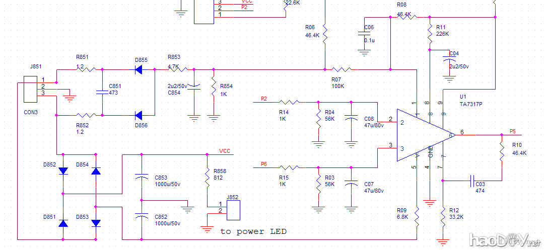 喇叭保护板主线路,大家都猜得到,就是TA7317P,这里做的有开关机防冲击 、中点偏移和电源电压异常的保护 ,大板子上的那部分是末级过电流保护
