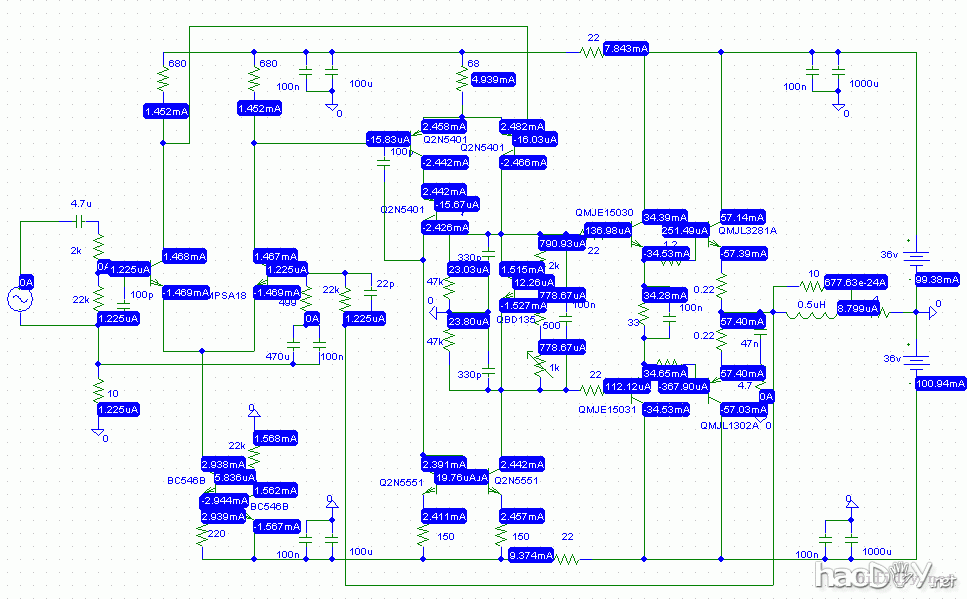 用了电子三分频后,后级功放一直用的是MX50,以前推惠威的箱子感觉很不错,惠威特别是S系列的低音比较肥厚,没有力度的缺点有了很大的改善。不过最近换成了15寸的德国三分频专业音箱,感觉用MX50推出来声音太干了一些,特别是低音太硬了,缺乏弹跳力和厚度。好几年前做过 Symasym 功放,当时觉得这个电路很均衡,声音比较温暖,低音潜得很深,趁休假开工
