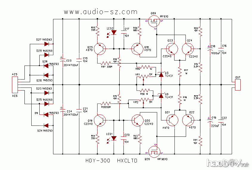 二、电路选择与设计:1、 因为平日看碟片时间超过听音乐时间,所以全遥控五声道就显得十分必要。而前三声道又占主导地位,所以前三声道用完全相同的电路。为方便制作、调试,倾向于选择差分输入的形式。经过查阅、收集大量资料,最终选定www.audio-sz.com HXCLTD前辈的HGF-100为蓝本。而左右环绕声道则将原有的简单差分输入功放重做电路板使用。 2、因为机箱还不错,散热器也大,抱着不做就不做,要做就做精的思想,确定左右两声道独立供电、差分级、推动级与推挽放大级分别供电,并且差分、推动级加入稳压电源。 3、至少需要接口:DVD及PC5.1声道输入;CD输入、TV输入;同轴、光纤输入(1543)。中置及超重低音信号输出。 二、PCB设计:全部用AUTOCAD设计,用过两个版本,即AUTOCAD2002及2004(因为设计了很久,搞得软件都升级了我还没设计完!)遥控、控制、输入切换部份没原理图,是因为这部份是我东拼西凑画出来的,所以没有现成的原理图,我也没画。不多说了,看图吧!