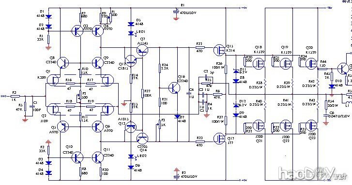 一个声道组装好的功放板,采用高品质元器件,并精心调整,采用洼田式并联+/-60.00V稳压,输入级采用K389/J109孪生发烧对管,推动级采用A1837/C4793对管,输出管采用K1058/J162场效应对管,音色偏暖色调整。