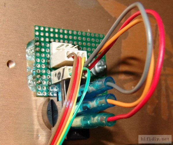 两块电源板下面的接地平衡板,直流电源地通过阻容结构与机箱接地点连接,机箱接地和交流接地连接,这样静态时的噪音低不可闻,只有夜深人静时贴紧高音才听到一点丝丝声。左边的小板十面板上的开关和LED指示板,主电源通过面板上一个12V的逻辑信号控制。
