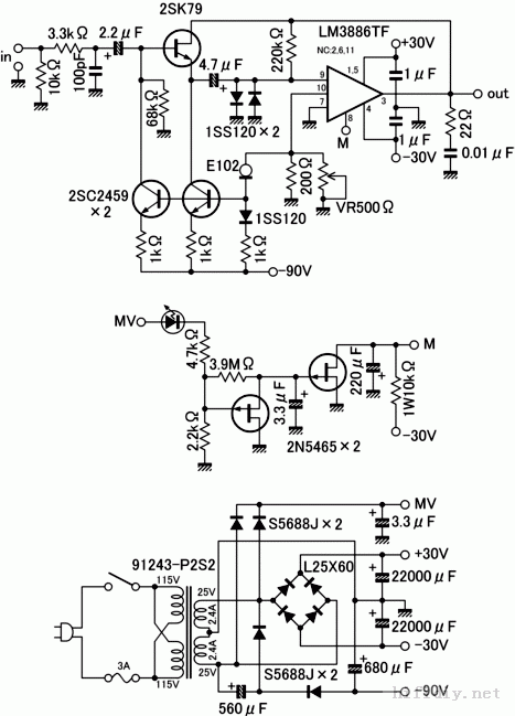 这段时间无聊,刚好手头上有几只老版的LM3886,所以想趁有时间折腾一下~~~~~~上网上找关于LM3886的制作帖子,发现大多数都是标准电路,也不知道哪个好~~~上了一个日本的DIY网站,刚好看到这个场管版的LM3886的功放好像很猛,而且网站上还附带有电路图,线路和制做也不是很复杂,想问问烧友这个电路怎么样?值不值得玩玩~~![]() ![]() ![]() ![]() E102是1mA恒流二极管 ![]() ![]() ![]() ![]() (责任编辑:admin) |