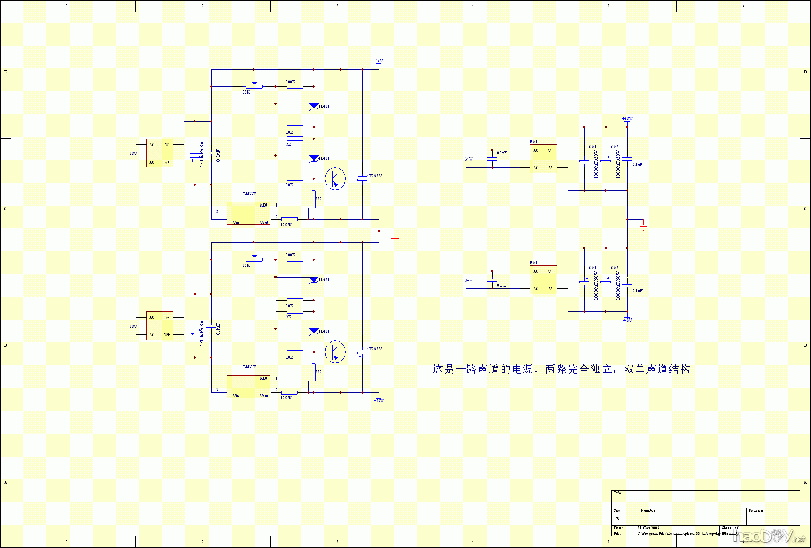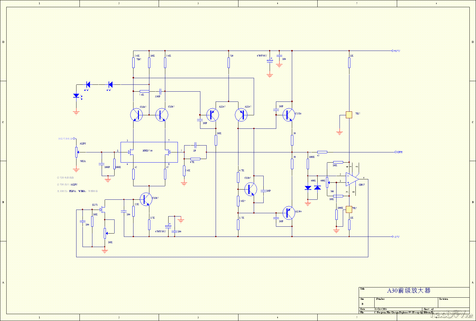 本后级外壳是利用其它壳子的,所以搭配的散热器也较小,静态电流达500MA,散热器较烫整个外壳都很热,夏天时要用电扇吹着用要好点,输出功率大概超过50W.直流电压:低压为50V,高压约60V,末级用K1530/J201每声道四对并联输出,滤波电容每路4万UF,变压器每路500W环牛,控制变压器20WR型,推杜希2.3足足有余,此功放制作调试前后花了一年半时间,关键是静态电流,输出零飘冷态和热态不一样,当然,最终解决了问题. 本人在调试时发现:冷态时,调好的电流到热态时变小了,此时如把电流调大,则冷态时电流大了很多,如不及时处理将有烧管子的危险,本人就吃过这个苦头,请各位朋友注意。最后本人参照有关资料在电路里加了稳压管及滤波等解决了问题,当然,从理论上来说对音质有所损害。本前级电阻用光英电阻,电容大多用ELNA及银母电容线路元件有些改动,末级输出用K2013/J313替换,并且静态电流调大一点,静态时散热器很烫,纯甲类结构,音质较晶体管来得柔和.