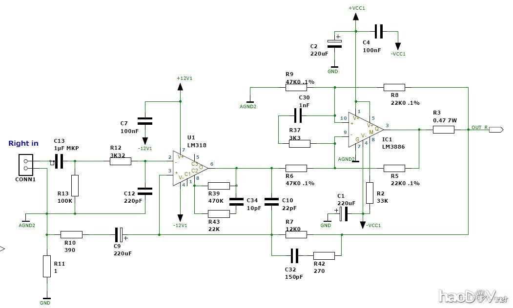 这是一个不同于官方和以往应用的电路,在这里LM3886只作为电流放大器使用,而电压放大交给了LM318,我想原创者是想以此获得更快的电压转换速率。
