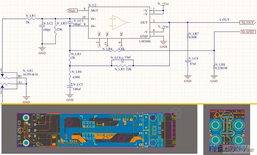 原理图和PCB,板子是30*140mm,变压器外置,整流滤波内置,板子虽小但供电,输出和地都是大铜铂走线,毕竟3886的胃口不小啊,左右声道对称设计,相应的元件和走线几乎相同,尽可能地减少差异,高度贴片化。