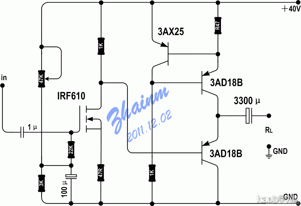 看电路应当很清楚滴,第一级场效应管放大,直耦到电流放大级, 上臂为恒流源,全电路全程直耦,两级均为单管单端放大,管子无需配对,电路图参数下双声道整机电流1300mA,整机功耗约55W,输出约2×5W;