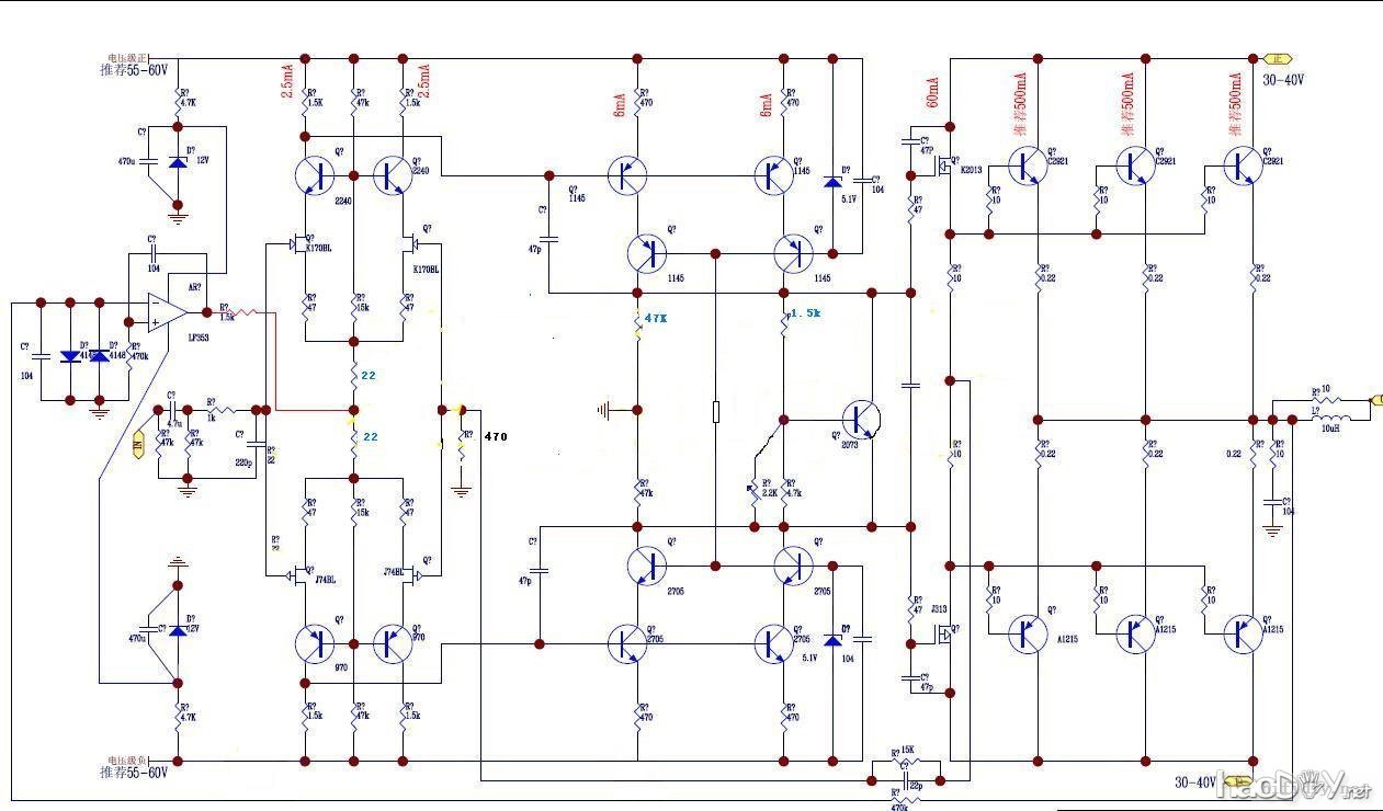 输入部分是仿照金嗓子305全对称的霍尔曼线路,本级电流大约2.1MA,大家都知道,这样线路的输入级噪声低,动态大等优点,电压放大是本线路的特别之处,这点主要说明,本来想用三级达林顿输出,但综合分析,多加一级是可以提高驱动力,增加低频的力度,但考虑到多一级会引起一些附加的失真,也容易引起自激而取舍掉,那么要好的驱动力,是功放满功率输出电压级也工作在纯甲类,单级管子必须加大静态电流,按输出50W甲类计算,电压级最少要2-5MA的电流,推动级保守说也要45MA以上,要没有这么大的电流,满功率输出肯定还有开关失真,这样就要求电压级电流也要大,最少要10MA左右,但一般的象1145/2705的小功率管子在+-50V电流大于8MA以后声音变粗,发热厉害,稳定性差,用中功率管子声音不理想等,根据这个缺点,本级采用了共射共基的方式,2对管子并联来增强电压放大级的驱动力,2对并联后每管子电流在5.5-6MA下,曲线最好,和自己搭棚用669/649做电压放实验,比669/649电流在12MA声音更圆润细腻,这点在实验后听感对比很明显,本电路的直流伺服也花费了很大的心思,传统的伺服控制点一般是反相输入端,根据众多烧友的反映,控制点取反相输入端伺服对功放声音影响很大,尤其是低频调制问题,根据这个问题,本人多次实验对比,把控制点取在输入差分级的上下臂的中点,这样对中点控制更好,可以低到1MV以下,还完全避免了伺服对声音的影响,通过多次割PCB换接点对比,证明此改动非常成功!功放的低频更从容大气,弹性更强,喇叭保护和稳压电源很平常普通,在此就不罗嗦了     最后要感谢本论坛狼,由于我不会用PROTEI99SE的软件,PCB和原理图是委托他帮我忙画的