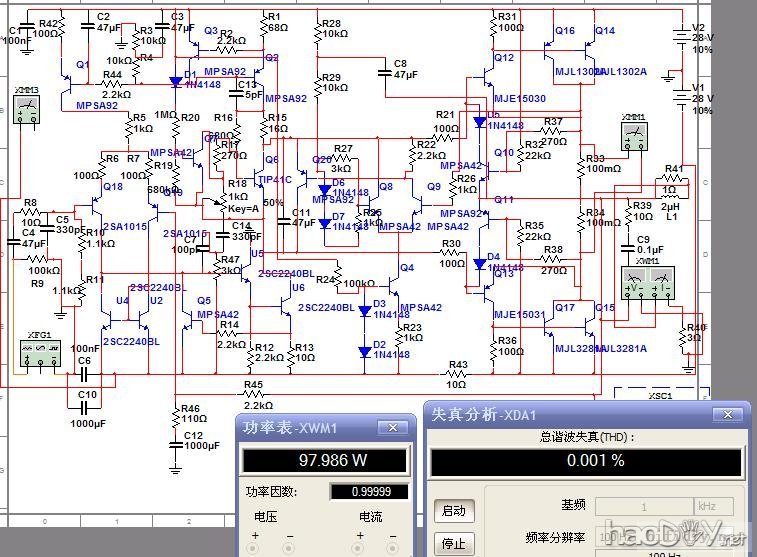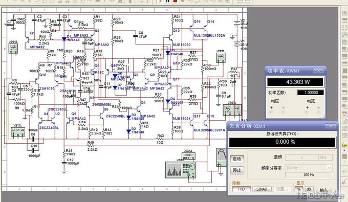 从仿真性能看,1KHZ 8Ω43W输出时在0.001%以下,失真性能看来相当不错。
