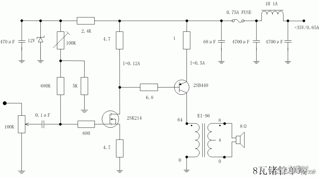 末级采用的2SB449锗管,电流0.6A,管压降27伏,喇叭阻抗8欧
