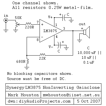 图片01:铝烤盘底盘最小的电路 - LM3875 IC芯片放大器(Gainclone)的概略为chipamp的图所示,在图01和包括只有三个电阻。这是非常相似已构造的简化方块的的许多gainclone放大器。布局如下我的veroboard的点至点的LM3875 gainclone芯片放大器和更进了一步通过消除小veroboard的。现在的底盘和活性成分的协同工作。纯的银线的输入信号和用于重型铜线被用于从芯片输出到扬声器接线柱。银焊料中使用的。 图01:原理图 - LM3875非反相Gainclone的放大器