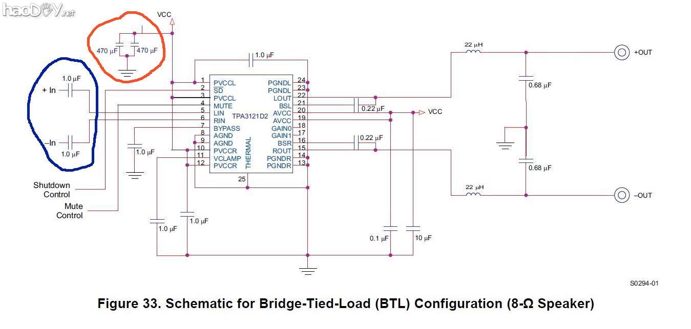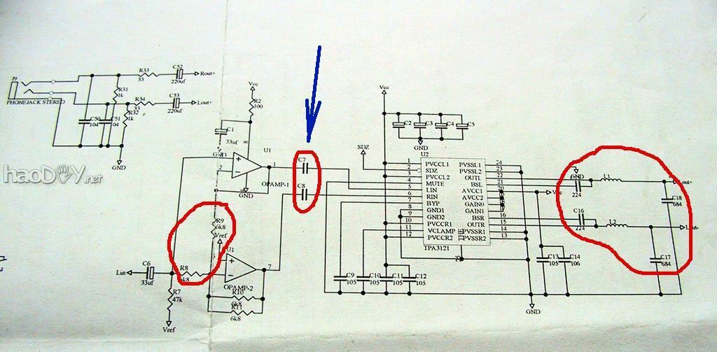 TI官方用1UF的耦合电容    套件用33UF NICHION  MUSE电解电容  (见照片兰色圆圈处) (责任编辑:admin)